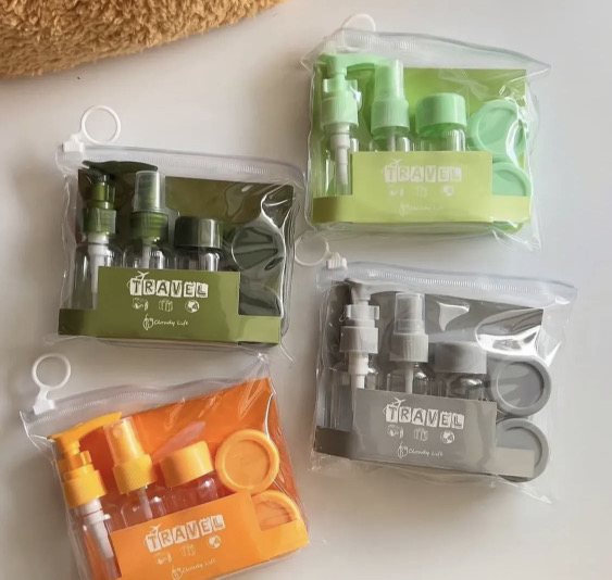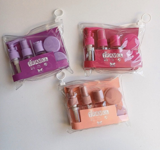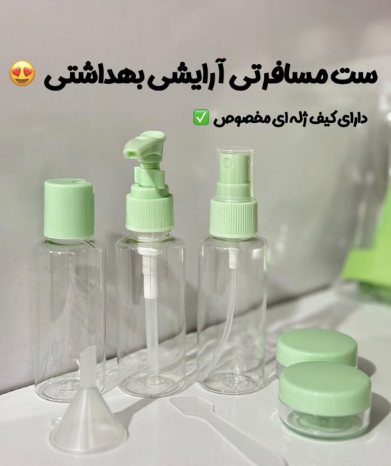 ست مسافرتی ۶تکه مراقبت آرایشی 🤩👜 این ۶ تکه شامل ✨:2 عدد اسپری/2عدد بطری1عدد قاشقشک و ۱ قیف کوچلو 2عدد ظرف درب دار کوچککاربرد اصلی این ست برای مسافرت هست، چون شما میتونید، محصولاتی مثل شامپو، صابون، مرطوب کننده، مواد ضدعفونی کننده و... رو به مقدار کافی در این محفظه ها بریزید 🤓و در کیف مخصوص خودش قرار بدید و به راحتی حمل کنید 😍.